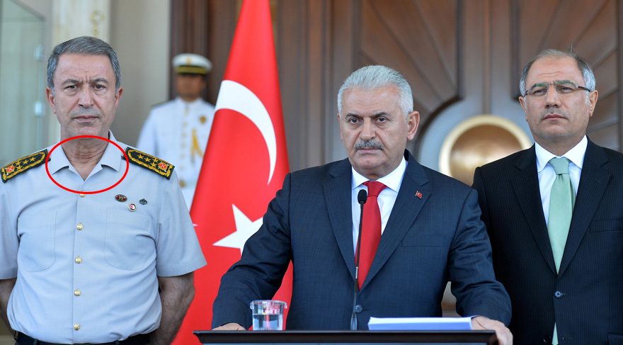 Hürriyet'in haberine göre; Genelkurmay Başkanı Orgeneral Hulusi Akar’ın özel kalem müdürü Tümgeneral Mehmet Dişli ile bazı emir subayları ve korumaları, darbecilerin yanında yer aldı. Tümgeneral Dişli, Orgeneral Akar’ın hazırlanan bildiriyi imzalamasını ve Türk kamuoyuna okumasını istedi. Ancak Orgeneral Hulusi Akar, son derece sert ifadelerle yapılanlara karşı çıktı. Orgeneral Akar ile emir subayları zaman zaman gırtlak gırtlağa geldi. Tümgeneral Dişli, Akar’ı başına silah dayayıp ölümle tehdit etti. Akar’a sert fiziki müdahalede bulunuldu; bir ara boynuna kemer geçirildi. Orgeneral Akar’ın boynundaki yara izinin de kemer sıkmadan kaynaklandığı ve bu nedenle önceki gün TBMM’deki oturuma boynunu kapatacak şekilde üniforma ile geldiği öğrenildi.