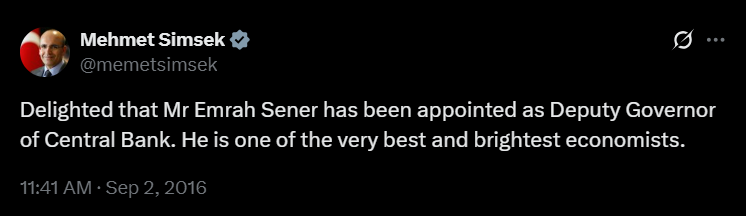 Bakan Şimşek'in 2 Eylül 2016 yılında Şener için “Emrah Şener’in Merkez Bankası Başkan Yardımcısı olarak atanmasından büyük memnuniyet duyuyorum. Kendisi en iyi ve en parlak ekonomistlerden biridir.” diye paylaşımı olduğu ortaya çıktı.