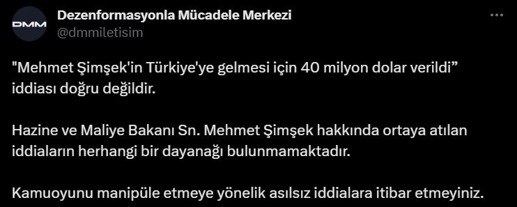 Dezenformasyonla Mücadele Merkezi, sosyal medya hesabından yaptığı açıklamada, "Hazine ve Maliye Bakanı Sn. Mehmet Şimşek hakkında ortaya atılan iddiaların hiçbir temeli bulunmamaktadır. Kamuoyunu manipüle etmeye yönelik asılsız iddialara itibar etmeyiniz." ifadelerini kullandı.