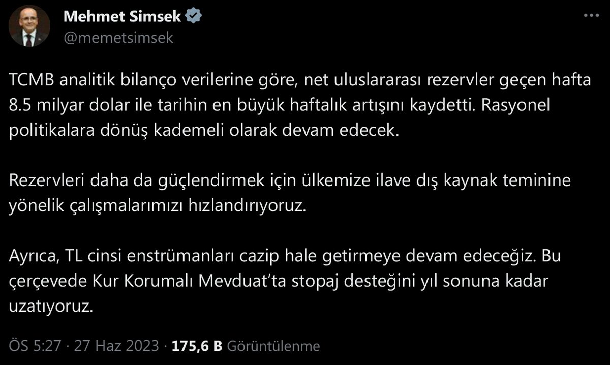 * "TCMB analitik bilanço verilerine göre, net uluslararası rezervler geçen hafta 8.5 milyar dolar ile tarihin en büyük haftalık artışını kaydetti. Rasyonel politikalara dönüş kademeli olarak devam edecek.