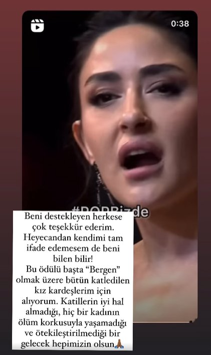 "Sesimiz hiç bir zaman kısılamayacak. Ben kadın şarkıcıların, kadın sanatçıların, bu toplumda kadınlığıyla her zaman gurur duyan bir kadınım. Her zaman onların arkasında olacağım. Kimse beni susturamayacak. Konuşmaya, üretmeye ve şarkı söylemeye devam."