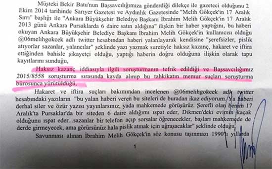 Odatv'de yer alan habere göre; Batu‘nun Ankara Cumhuriyet Başsavcılığı’na yaptığı suç duyurusu üzerine başlatılan soruşturmada Gökçek’in ifadesine başvurulacak. Gazeteci Bekir Batu, savcılığa sunduğu dilekçesinde “2 Ekim 2014 tarihinde gerek kendi gazetesinde gerekse Aydınlık Gazetesi’nde Gökçek’in 17 Aralık tarihinde büyük rüşvet operasyonu yapılırken Ankara Pursaklar’da tam 6 adet daire birden satın aldığını ve söz konusu haberi tapu kayıtlarıyla belgelendirdiğini ancak bu haberden sonra Gökçek’in kendisine sosyal medya üzerinden hakaret ettiğini” savundu.