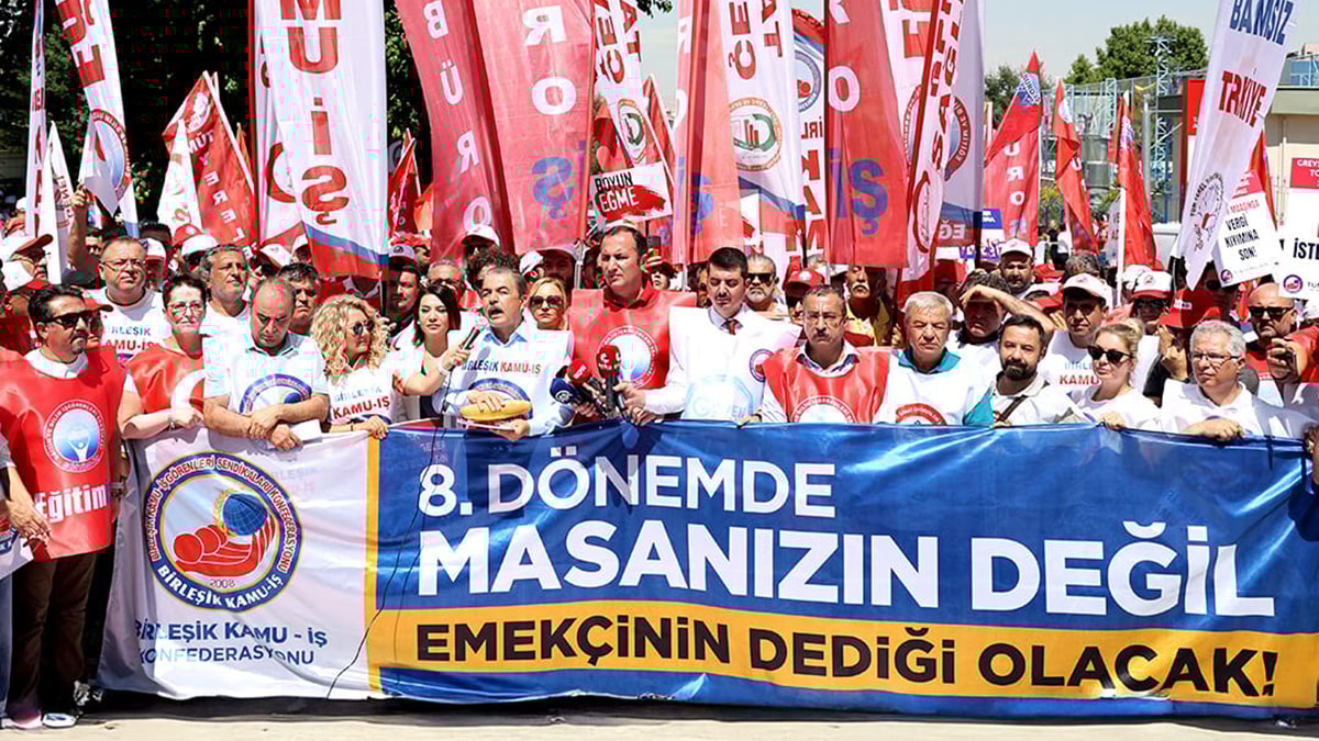 KESK üyeleri ”AKP Zammını al başına çal” pankartı açtı. Birleşik Kamu İş Başkanı Orhan Yıldırım, “Karşımızda aklımızla alay eden bir hükümet var. Hakkımızı söke söke alacağız. Bize utanmadan kamuda tasarruf masalları anlatıyorlar. Sarayın bir günlük harcaması 46 milyon lira her devlet kurumunun tepesinde 3 ve 5 maaşlı yandaş bürokratlar var’” dedi. Buna rağmen iktidar dün akşam saatlerinde gerçekleştirdiği zam teklifinde toplam 2 puanlık artışa gitti. Yüzde 10+6 olan zam teklifini yüzde 11+7’e yükseltti. Böylece 2026 yılı için ilk altı ay yüzde 11, ikinci altı ay yüzde 7; 2027 yılı için ise ilk ve ikinci altı aylarda yüzde 4’er zam teklif edildi. Daha önce dile getirilen 1.000 TL taban aylığı artışı da tekrarlandı.