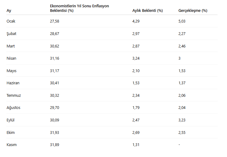 Ekonomistlerin 2025 yıl sonu enflasyon beklentisi, kasım itibarıyla yüzde 31,89 oldu.