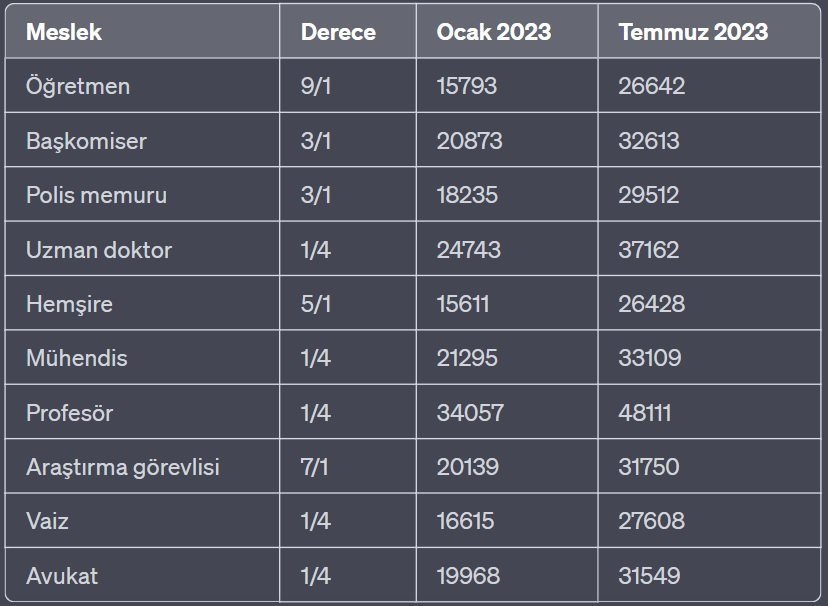 Ortalama memur maaşı aralık 2022 tarihinde 10 bin 932 lira iken ocak 2023 tarihinde 14 bin 417 liraya, şimdi ise 2023 temmuzunda 25 bin 15 liraya çıkartılacaktır. Temmuz artış oranı ise ortalama memur maaşında toplamda yüzde 74'e karşılık gelmektedir.”