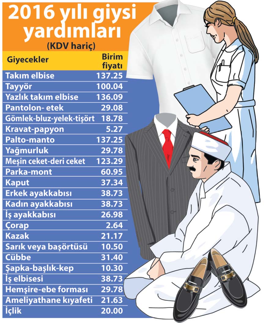 Hükümet en son 2014 yılında Devlet Memurları Giysi Yardımı Yönetmeliği’nde değişiklik yaparak müftü, vaiz, imam-hatiplere verilen cübbe ve sarık yardımına başörtüsünü de eklemişti. Aynı değişiklikle ayrıca cübbe ve sarık yardımından yararlanan personel listesine ilk kez müezzin-kayyumlar da ilave edilmişti. Cübbe, sarık ve başörtüsü ilgili devlet memurlarına 2 yıllık süre için veriliyor. 2 yılın ardından giyecekler yenileniyor. Devletin cübbe yardımından din görevlilerinin dışında avukat, hakim, savcı ve hukuk müşavirleri de yararlanıyor. Maliye’nin bu yıl için uygulanmasını istediği giysi yardımı genelgesine göre devlet memurlarına KDV hariç olmak üzere yapılacak takım elbise yardımı 137.25 lirayı, gömlek yardımı 18.78 lirayı, ayakkabı veya iş elbisesi yardımı 38.73 lirayı, yün eldiven yardımı 3.37 lirayı geçemeyecek.