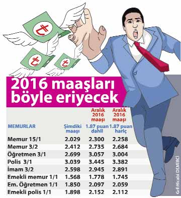 Enflasyon farkındaki bu değişiklik nedeniyle örneğin bugün 2 bin 29 lira maaş alan en düşük dereceli bir memurun maaşı ocak ayında yüzde 6 zamla 2 bin 150 lira, temmuzdan itibaren de 2 bin 258 lira olacak. Buna karşılık, 1,87 puanlık fark budanmamış olsaydı aynı memurun ocak maaşı 2 bin 191 lira, temmuz maaşı da 2 bin 300 lira olacaktı. Bu memur 2017 yılına 42 lira fazla maaşla başlayacak, yeni zamları da bu maaşının üzerine alacaktı. Aynı şekilde bugün bin 898 lira olan polis emeklisinin temmuz maaşı 2 bin 152 lira olacağı yerde 2 bin 112 liraya düşecek.