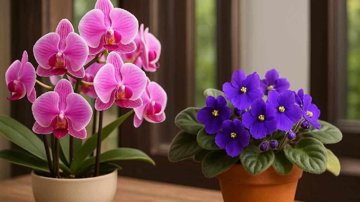 Doğru sulama tekniği ve doğal gübreleme, hem orkidelerin hem de menekşelerin kesintisiz çiçek açmasını mümkün kılıyor.