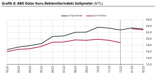 12 ay sonrası döviz kuru beklentisi ise aynı anket dönemlerinde sırasıyla 23,43 TL ve 23,10 TL olarak gerçekleşti.