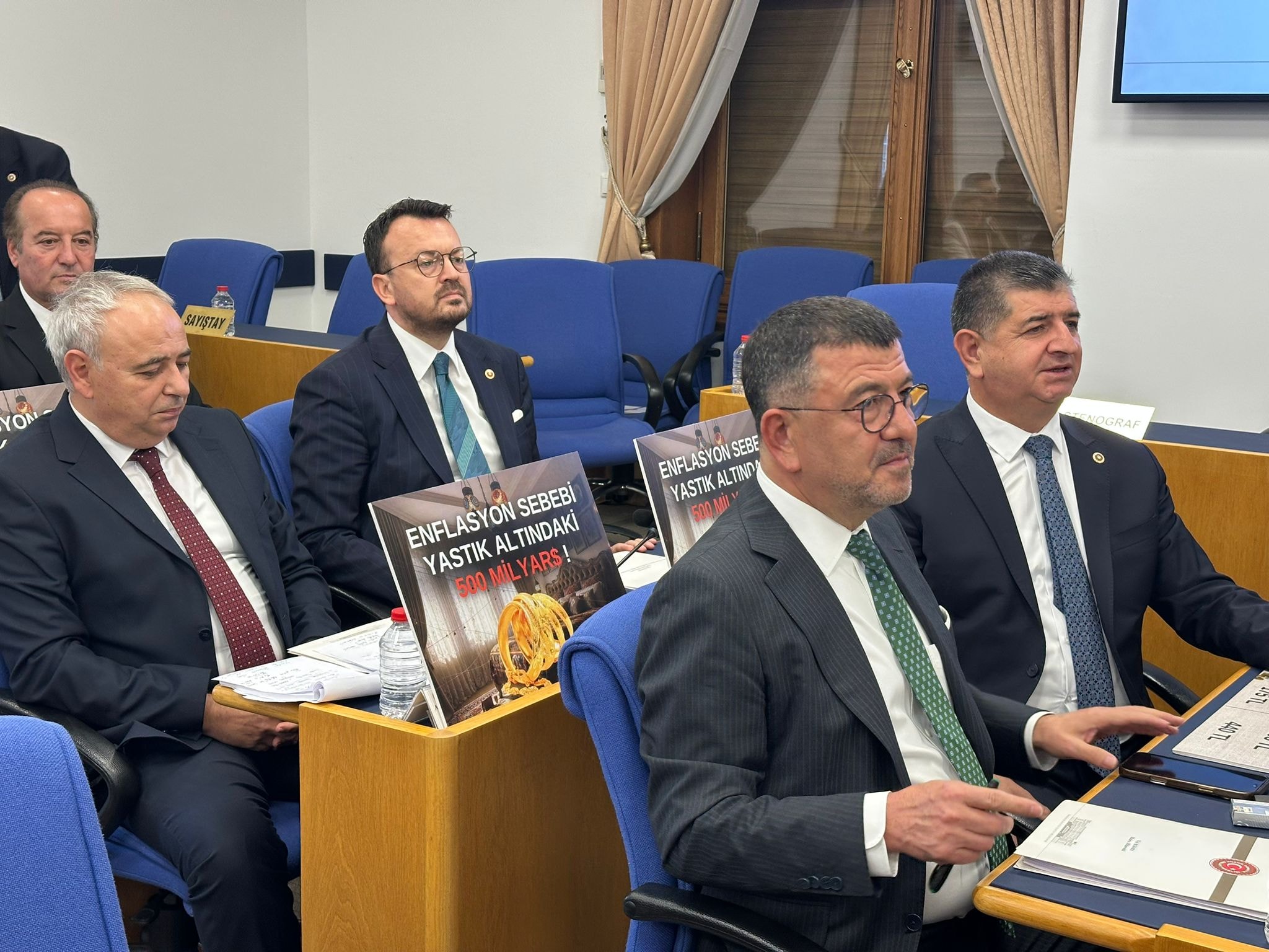 CHP milletvekilleri komisyon sıralarına “Enflasyonun sebebi yastık altındaki 500 milyar dolar” yazılı dövizler yerleştirdi. Protesto sırasında konuşan CHP Malatya Milletvekili Veli Ağbaba, iktidarın enflasyonun gerçek nedenlerini görmezden geldiğini savundu.