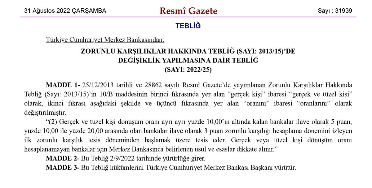 Bu kapsamda, mevduat ve katılım bankaları, tüzel kişilerin yabancı para mevduat ve katılım fonu hesapları için de belirlenen dönüşüm oranına göre ilave yabancı para zorunlu karşılık tesis edecek.
