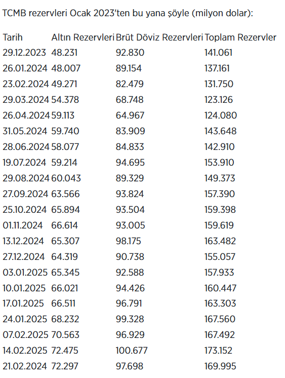 Böylece Merkez Bankasının toplam rezervleri, 21 Şubat haftasında bir önceki haftaya göre 3 milyar 157 milyon dolar azalışla 173 milyar 152 milyon dolardan 169 milyar 995 milyon dolara düştü.
