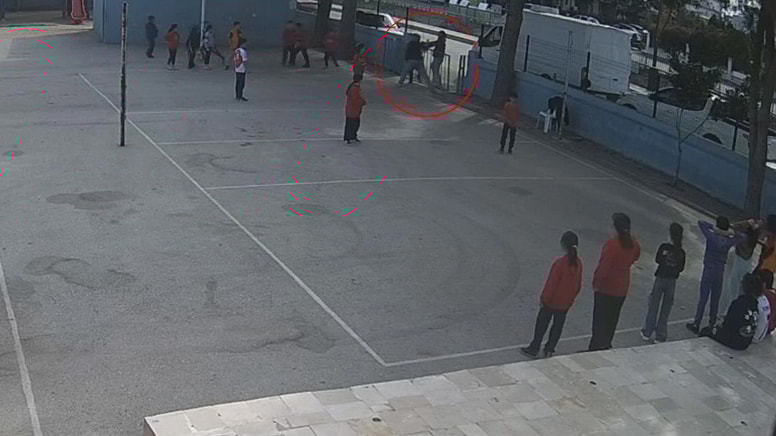 Okulun güvenlik kamerasınca kaydedilen görüntüde, okulun bahçesine giren zanlıların öğretmeni darbetmesi ve olayı gören öğrencilerin kaçışması yer aldı.
