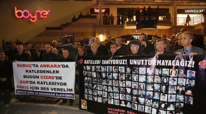 İbrahim MAŞE MERSİN, (DHA)- MERSİN`de Ankara`da meydana gelen bombalı saldırıda hayatını kaybedenleri anan bir grup, Cizre ve Sur İlçelerinde gerçekleştirilen operasyonları protesto etti.
