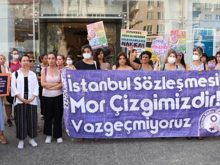 İstanbul Sözleşmesi’nin kaldırılmasının iptaline yönelik verilen ret kararına Mersin'de bir araya gelerek tepki gösteren kadınlar, İstanbul Sözleşmesi’nden vazgeçmeyeceklerini dile getirdi.