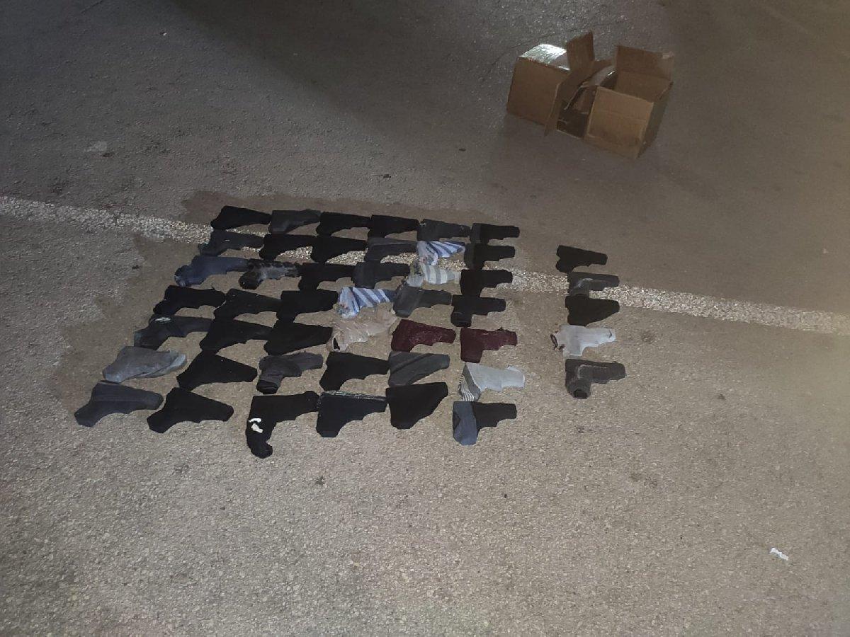 Araçta yapılan kapsamlı aramada bagaj bölümündeki kutularda, çorap içerisine gizlenmiş 47 adet ruhsatsız 'Glock' marka tabanca ele geçirildi.