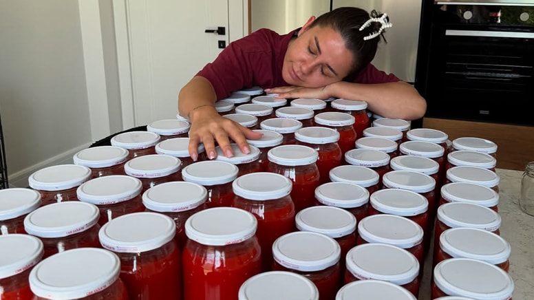 Özbey, hazırladığı onlarca kavanoz domates sosunu Instagram hesabından "Bunların hepsi benim bebeklerim" notuyla paylaştı.