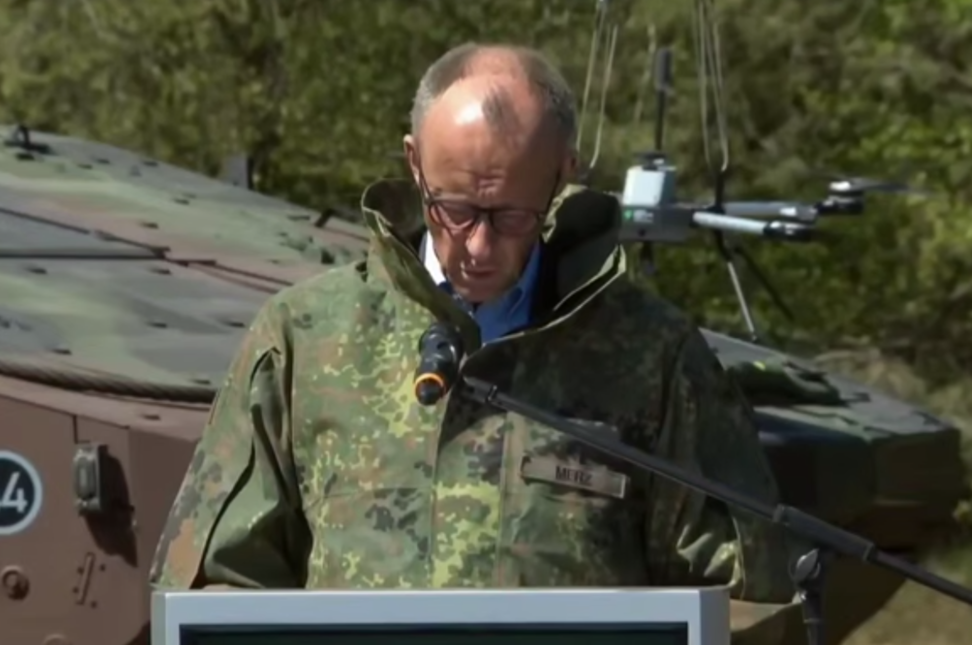 Üstüne kamuflajları çeken Merz, Munster'deki askeri üsteki ziyaretinde bizzat tanka bindi ve kafasında tank komutanı kulaklığını takarak askeri güçleri yönetti.