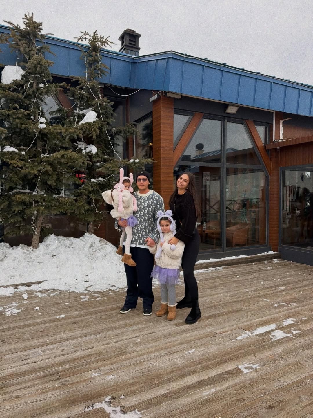 Okulların ara tatile girmesiyle Uludağ'a giden aile, kızlarıyla karda eğlendi.