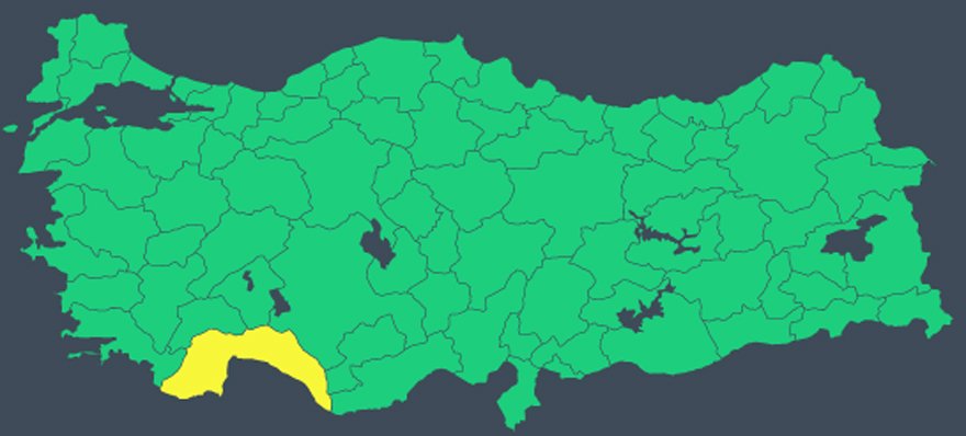 Meteoroloji'nin MeteoUyarı sistemine göre Antalya'da bugün için sarı uyarı yayınlandı. Gök gürültülü sağanak yağışın etkili olacağı belirtilen sarı uyarıda hava durumunun potansiyel tehlikeli olduğu ifade edilerek "Tahmin edilen meteorolojik hadise olağandışı olmamakla birlikte, meteorolojik şartlardan etkilenebilecek faaliyetler konusunda dikkatli olunmalıdır" denildi.