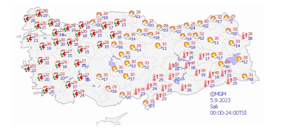 Meteoroloji'den yapılan son açıklamaya göre; Salı günü ise Marmara, Ege ve İç Anadolu'da sağanak ve gök gürültülü sağanak bekleniyor.