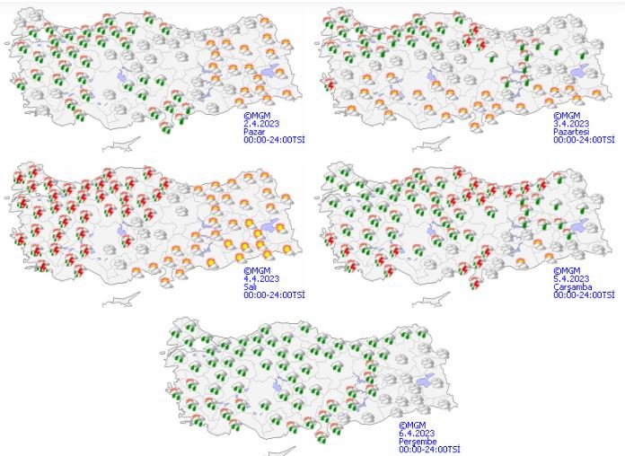 Meteoroloji Genel Müdürlüğü tarafından yapılan son değerlendirmelere göre: Ülkemiz genelinin parçalı ve çok bulutlu, Marmara'nın güney ve doğusu, Kuzey ve İç Ege, Akdeniz ve Batı Karadeniz ile Tekirdağ, Samsun, Çorum, Eskişehir, Çankırı, Ankara'nın kuzey ve batı ilçeleri, Aksaray, Niğde, Nevşehir, Kayseri, Gaziantep ve Kilis çevrelerinin aralıklı sağanak yağışlı geçeceği tahmin ediliyor.