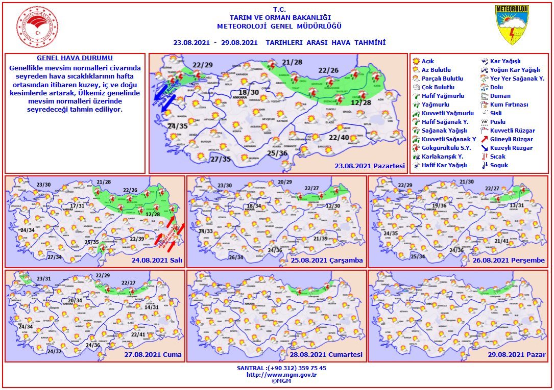 Meteoroloji Genel Müdürlüğü tarafından yapılan son değerlendirmelere göre ülkemizin kuzey ve doğu kesimlerinin parçalı ve yer yer çok bulutlu; Orta Karadeniz kıyıları, Doğu Karadeniz, Doğu Anadolu'nun kuzeyi ile Çanakkale'nin iç, Balıkesir ve Uşak'ın kuzey kesimleri, İstanbul, Kocaeli, Sinop, Tokat ve Afyonkarahisar çevrelerinin yerel olmak üzere sağanak ve gök gürültülü sağanak yağışlı, diğer yerlerin az bulutlu ve açık geçeceği tahmin ediliyor.