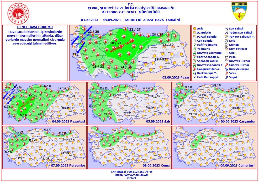MGM'den yapılan bir diğer açıklamaya göre ise; Pazar günü (3 Eylül) ilk saatlerden itibaren Ankara, Eskişehir, Konya, Çankırı, Kırıkkale, Yozgat, Sivas, Kayseri, Kırşehir, Aksaray ve Niğde'de aralıklı ve yerel olarak kuvvetli sağanak ve göl gürültülü sağanak bekleniyor.