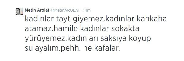 Özellikle sosyal medyada çok sayıda eleştiri alan bu sözlerin yanlış anlaşıldığını söyleyen Bülent Arınç bu defa da "Kocasını bırakıp sevgilisiyle tatile çıkanlar direği gördüğünde dayanamayıp direğe çıkanlar… Böyle bir hayatın içinde siz olabilirsiniz" şeklinde konuşunca pek çok kişinin tahammül sınırı geçilmiş oldu. Arınç’ın sözlerine tepki veren yüzlerce isim arasında Metin Arolat da vardı. Başarılı şarkıcı,  Metin Arolat kahkaha attığı için eleştirilen ve kadınların her geçen gün değersizleştirildiği AKP iktidarında kadının yerini şu sözlerle anlatmış: