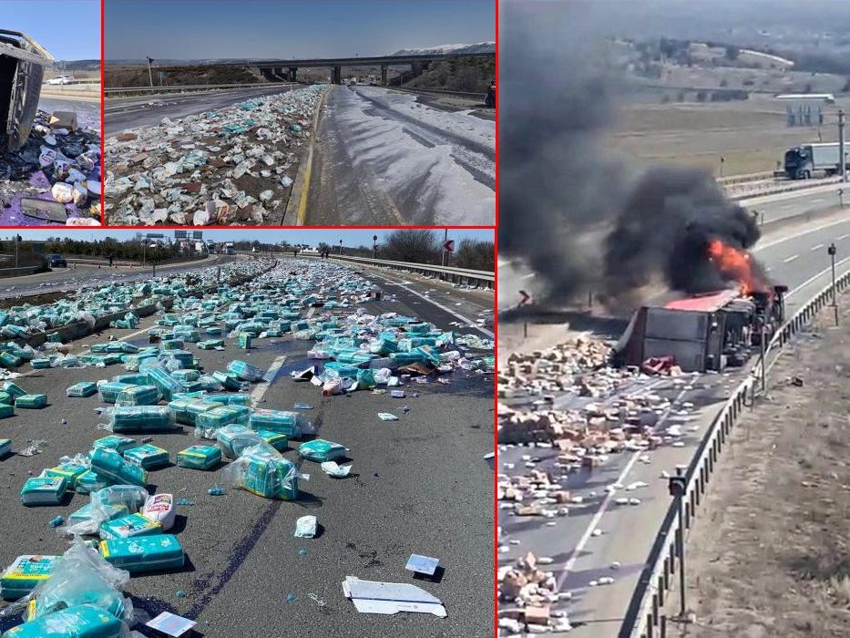 TIR dorsesinde bulunan yüzlerce çocuk bezi ve deterjan yola savrulurken, aniden alev alan araç yanmaya başladı. Kazada sürücü yaralanırken, durumun bildirilmesi üzerine olay yerine jandarma, itfaiye ve 112 Acil Servis ekipleri sevk edildi.
