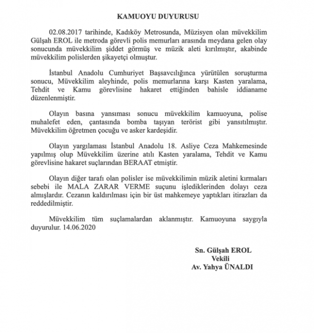 Müzisyen Gülşah Erol, bundan 3 yıl önce metroda kendisini darp eden ve müzik aletini kıran polislerden şikayetçi olmuştu. Dava sonuçlandı. Polisler, "mala zarar verme" suçundan ceza alırken, Erol hakkında açılan "kamu görevlisine hakaret" suçundan ise beraat çıktı.