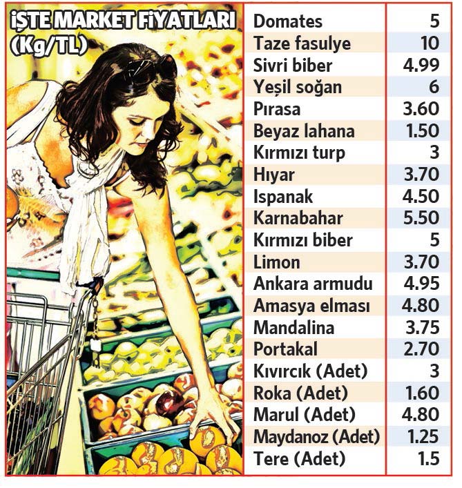 Kar ve fırtına nedeniyle İstanbul’a mal taşıyan kamyonların yollarda kalması başta domates olmak üzere marul, yeşil soğan ve yeşil biber fiyatlarını uçurdu. Marketlerde domatesin kilosu 5 TL’den, marulun tanesi ise 4.5 liradan satılmaya ba başlandı. Tüm Bostan Sebze Meyve Komisyoncu Tüccarlar Federasyonu (TÜMESKOM) Başkanı Burhan Er, halin bugün ve hafta sonu da kapalı olacağını belirterek, “Hava şartları normale dönünceye kadar fiyatlar gerilemez” dedi.