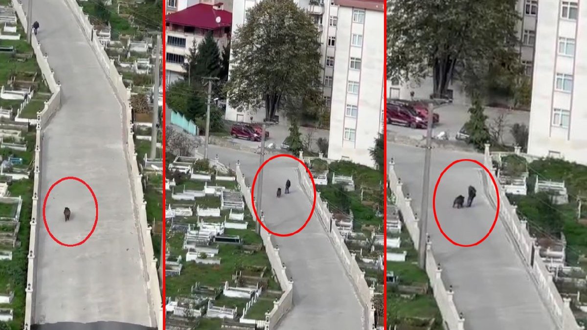 Giresun'un Espiye ilçesinde kabristandan geçen yolda yürüyen bir kişi, mahalleye inen yaban domuzunun saldırısından son anda kurtuldu...