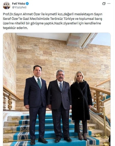 Yıldız, buluşmaya ilişkin değerlendirmesini sosyal medya hesabı üzerinden paylaştı. Açıklamasında, “Prof. Dr. Sayın Ahmet Özer ile kıymetli kızı, değerli meslektaşım Sayın Seraf Özer’le Gazi Meclisimizde terörsüz Türkiye ve toplumsal barış üzerine nitelikli bir görüşme yaptık” ifadelerine yer verdi.