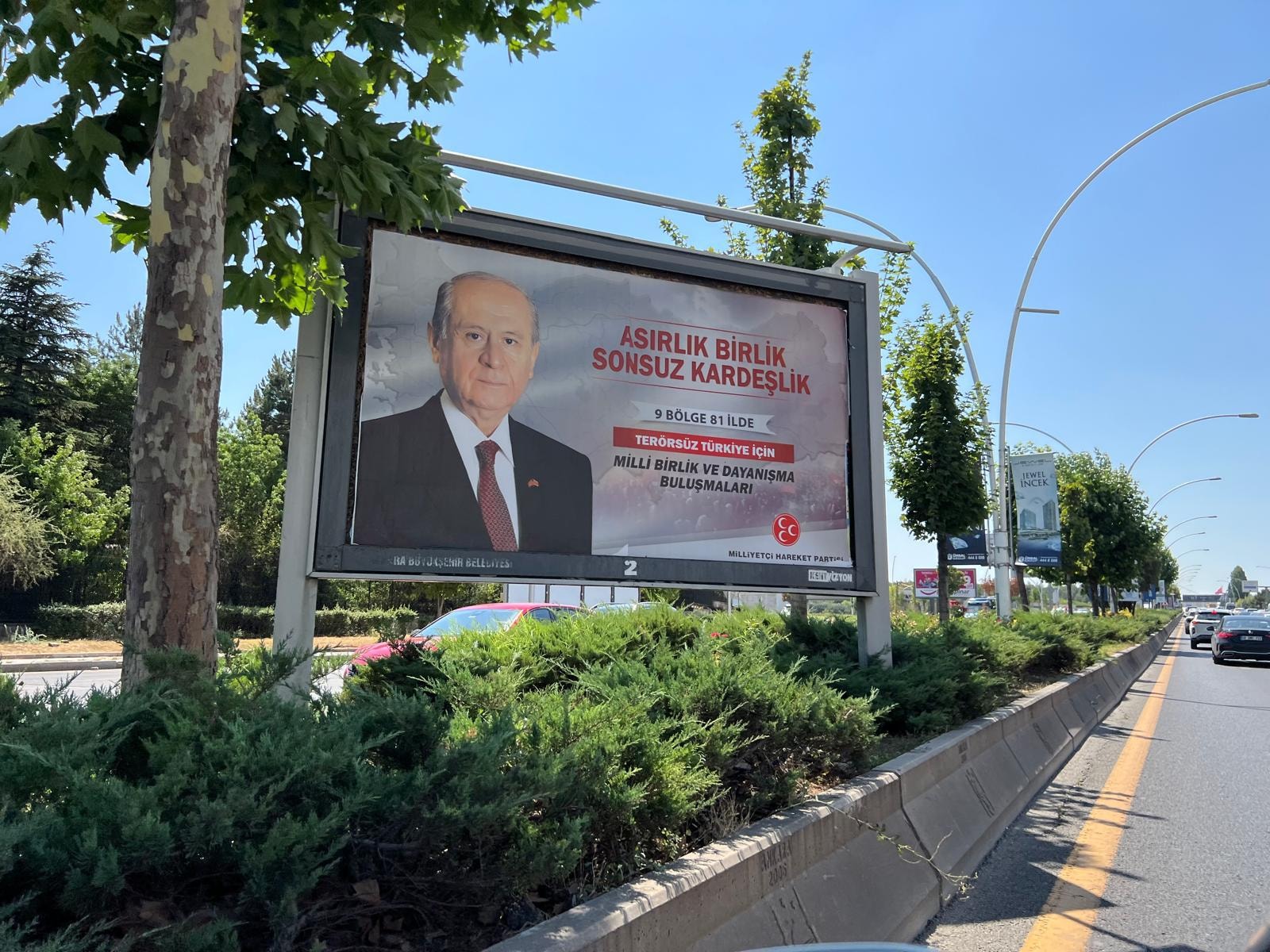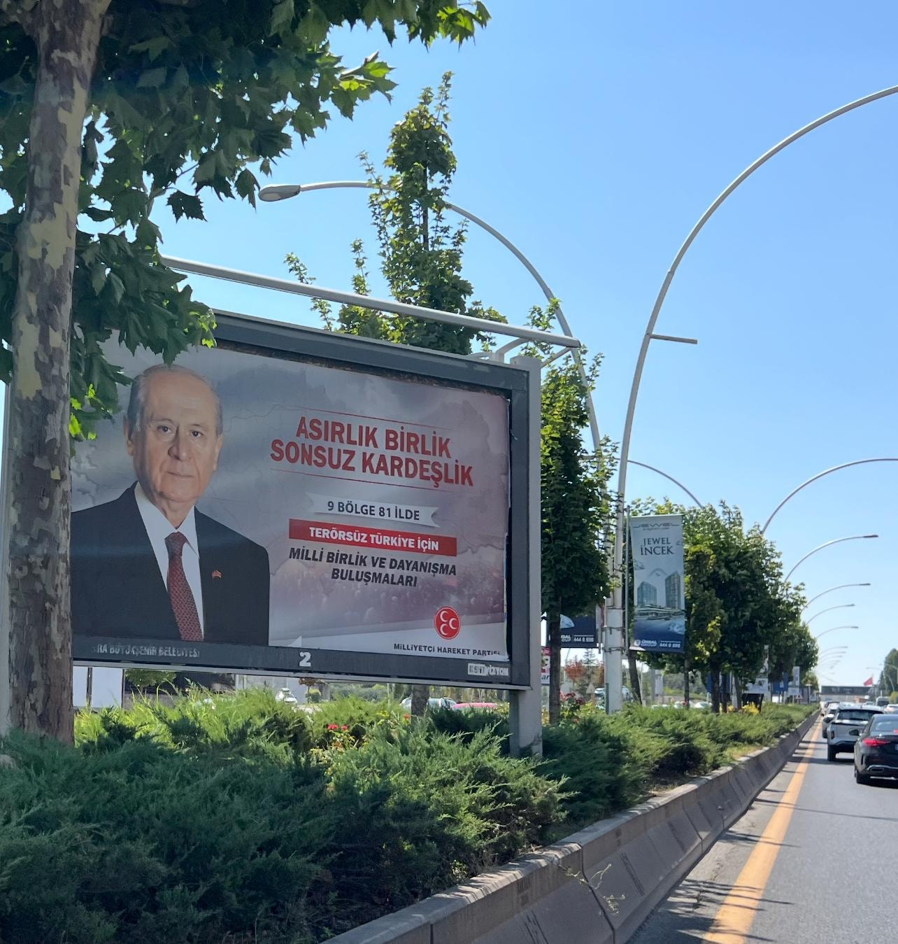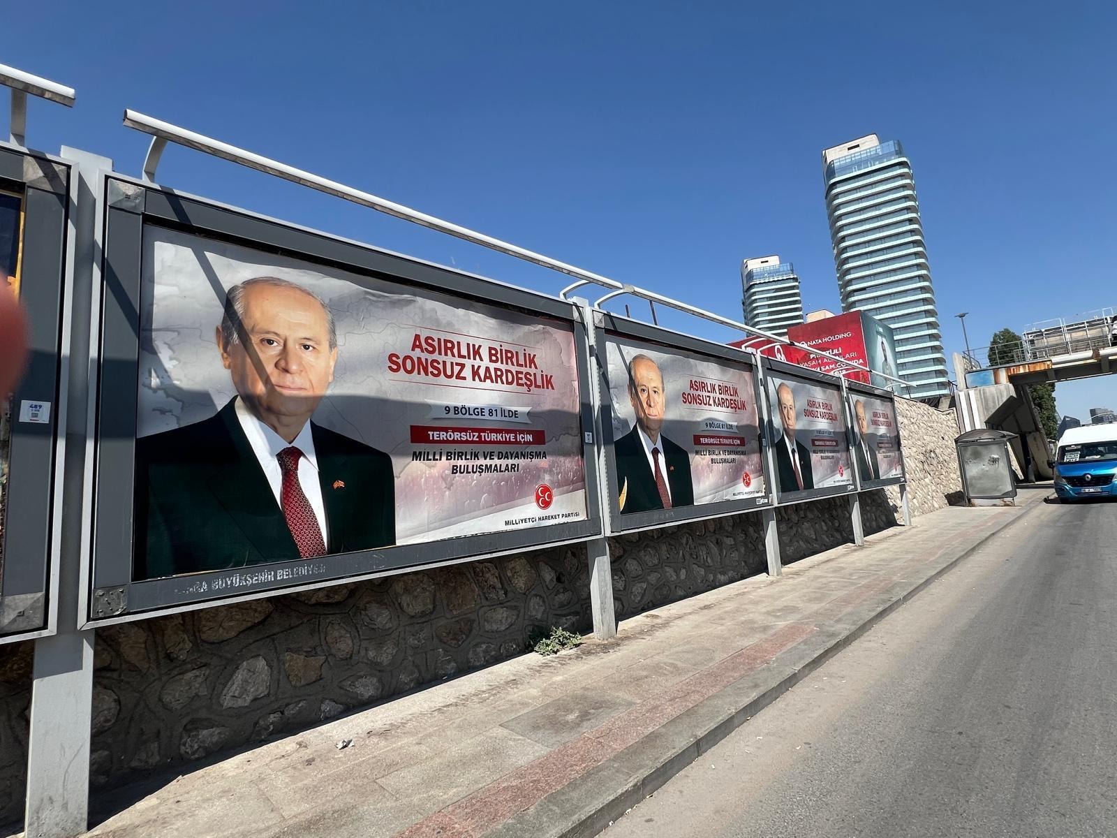 Afişte, MHP lideri Devlet Bahçeli'nin fotoğrafıyla beraber MHP'nin logosu ile "9 bölge 81 ilde", 'Terörsüz Türkiye' için Milli Birlik ve Dayanışma Buluşmaları ifadeleri yer aldı.