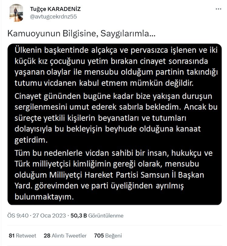 - Tüm bu nedenlerle vicdan sahibi bir insan, hukukçu ve Türk milliyetçisi kimliğimin gereği olarak mensubu olduğum Milliyetçi Hareket Partisi Samsun İl Başkan Yardımcılığı görevimden ve parti üyeliğinden ayrılmış bulunmaktayım."