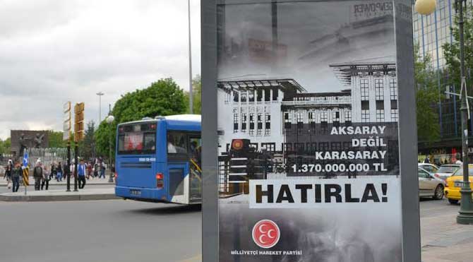 Ankara’daki reklam panolarında, MHP’nin ‘’Aksaray değil, Karasaray... 1. 370.000.000 TL… Hatırla’’’’ ibaresi yer alan afişleri ve arka planda da Sarayın görüntüsü yer aldı.