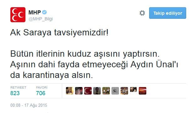 Erdoğan'ın metin yazarı da olan Ünal'a yanıt yine twitter'dan geldi. MHP'nin resmi Twitter hesabından atılan twette "Ak Saraya tavsiyemizdir! Bütün itlerinin kuduz aşısını yaptırsın. Aşının dahi fayda etmeyeceği Aydın Ünal'ı da karantinaya alsın." ifadeleri kullanıldı.