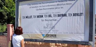 Muğla’nın Fethiye İlçesi’nin Belediye Başkanı MHP’li Behçet Saatcı, Türkçe ve Kürtçe kelimelerin karışık yer aldığı Kurban Bayramı mesajını ilçenin farklı noktalarındaki billboardlara astırdı, ’tek millet, tek dil’ göndermesinde bulundu.Fethiye Belediyesi tarafından geçen Ramazan Bayramı’nda cadde ve sokaklardaki billboardlara asılan ’Ülke bütünlüğümüzün bozulmaması ve içimizdeki insan sevgisinin kuvvetlenmesi dileklerimizle, iyi bayramlar’ ifadelerinin yer aldığı bayram mesajı, Kurban Bayramı için de asıldı. Ancak mesajdaki kelimeler bu kez, ’Türkçe’ ve ’Kürtçe’ karışık yazıldı. İlanda şu ifadeler yer aldı: "Ülke bit?n?yme bozulmaması ve hezkırına insana dı h?ndure me kuvvetlenmesi dılxaziya meye. Qurban Bayramımız piroz be."