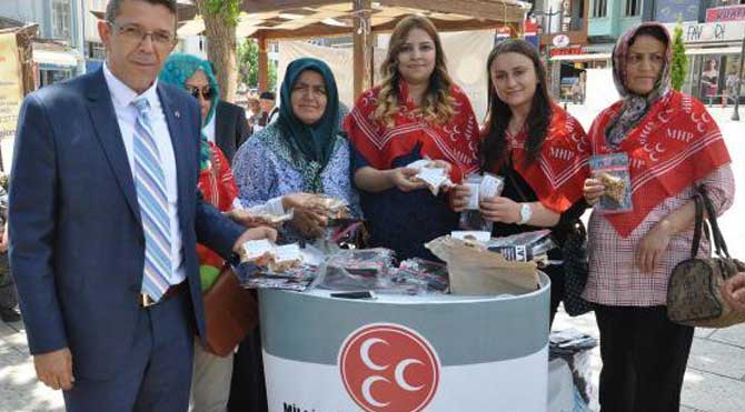 Bayramyeri Meydanı'nda stant kuran MHP İl yönetimi, Maliye Bakanı Mehmet Şimşek'in Türkiye'de kamuda kullanılan makam araçlarının maliyetine yönelik söylediği "çerez parası" sözünü leblebi dağıtarak eleştirdi.