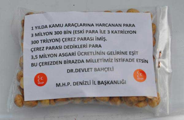 Partililer, 100 gramlık poşetler içinde hazırlanan 10 bin leblebiyi parti broşürleriyle birlikte "Bir avuç merçerez" diyerek dağıttı. Çok sayıda vatandaş, leblebilerden aldı. Poşetlerin üzerinde, 'Bir yılda kamu araçlarına harcanan para 3 milyar 300 milyon (Eski para 3 katrilyon 300 trilyon) çerez parası imiş. Çerez parası dedikleri para 3.5 milyon asgari ücretlinin gelirine eşit. Bu çerezden biraz da milletimiz istifade etsin. Dr. Devlet Bahçeli, MHP Denizli İl Başkanlığı' yazısı olduğu görüldü.