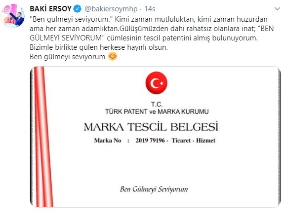 Marka tescil belgesini sosyal medya hesabında paylaşan Ersoy, "Kimi zaman mutluluktan, kimi zaman huzurdan ama her zaman adamlıktan. Gülerken güldürmeyi nasip eden Cenab-ı Allah'a şükür olsun, gülüşümüzden dahi rahatsız olanlara inat; 'Ben gülmeyi seviyorum' cümlesinin tescil patentini almış bulunuyorum. Bizimle birlikte gülen herkese hayırlı olsun. Ben gülmeyi seviyorum" ifadelerini kullandı.(DHA)