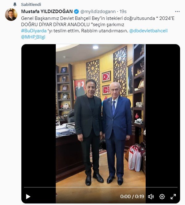 Yıldızdoğan, sosyal medya hesabından yaptığı paylaşımda, "Genel Başkanımız Devlet Bahçeli Bey'in istekleri doğrultusunda '2024'e Doğru Diyar Diyar Anadolu' seçim şarkımız 'Bu Diyarda'yı teslim ettim. Rabbim utandırmasın" ifadelerini kullandı.