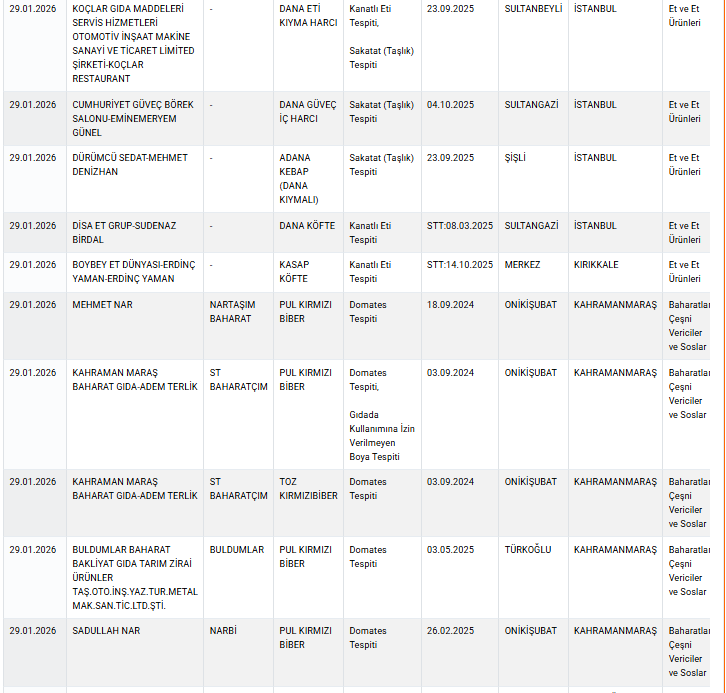 Listenin en dikkat çeken başlıklarından biri de et ürünleri oldu. Adana kebap, döner, köfte, lahmacun harcı ve çiğ ürünlerde yapılan incelemelerde;
