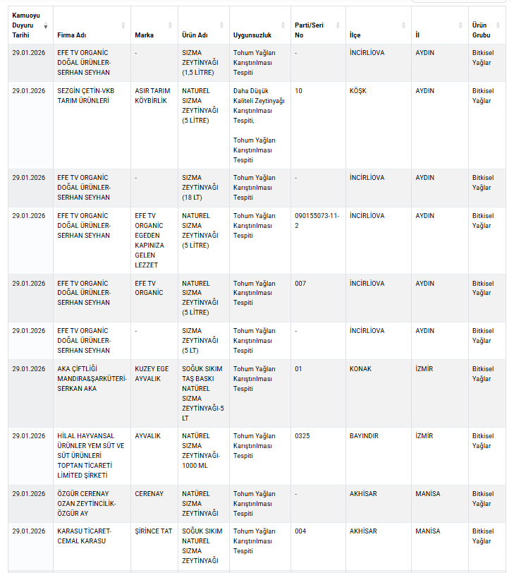 Zeytinyağı denetimlerinde ise doğal sızma zeytinyağı adıyla satılan birçok üründe tohum yağları karıştırıldığı belirlendi. Aydın, İzmir, Manisa ve Tekirdağ’da faaliyet gösteren firmaların bazı ürünlerinde;