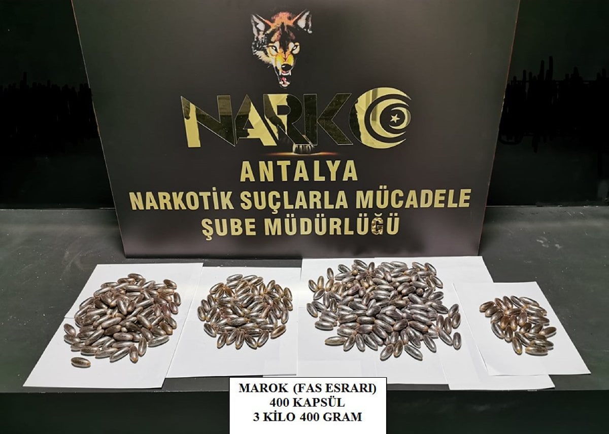 Antalya Havalimanı'nda uçaktan indikten sonra ülkeye giriş yapmaya hazırlanan Faslı dört şüpheli, polis tarafından gözaltına alındı. Şüphelilerin hastanede yapılan kontrollerinde, mide ve bağırsaklarında 400 kapsül içerisinde, 3 kilo 400 gram marok (Fas esrarı) olduğu belirlendi.