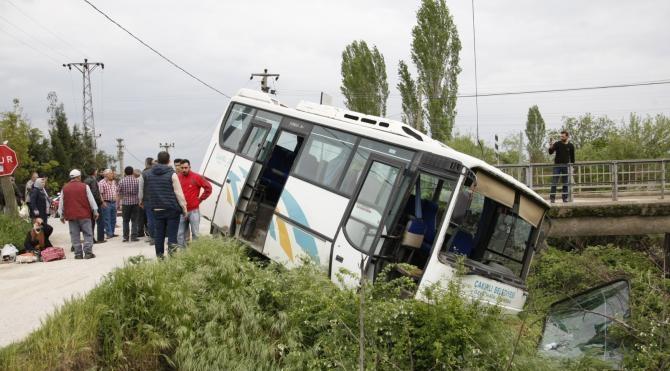 Orhangazi’ye bağlı Çakırlı Mahallesi’ne sefer yapan Özkan Arı (50), yönetimindeki 16 VN 887 plakalı yolcu midibüsle ilerlerken, aniden önüne çıkan kamyona çarpmamak için direksiyonu kırıp frene bastı. Savrulan araç, yoldan çıkarak dere yatağına girdi.