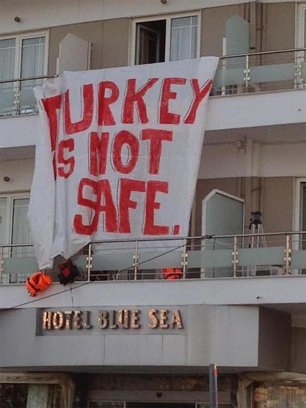 FOTO: SÖZCÜAçılan üç pankartta “Türkiye güvenli değil”, “Midilli Belediyesi’ne ait kamp açık kalsın, dayanışma sürsün”, “Feribotlar güvenli geçiş içindir, sınır dışı etmek için değil” yazıları yer aldı.