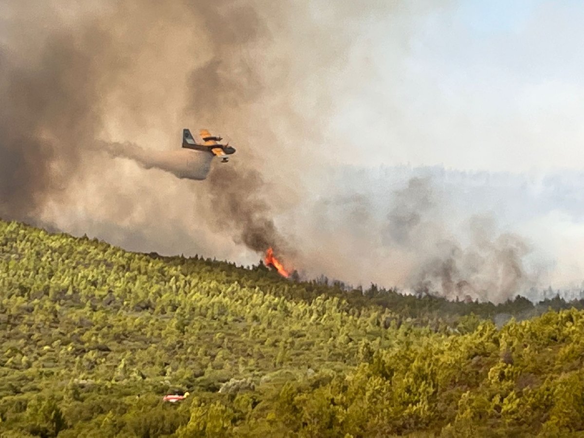 Muğla Orman Bölge Müdürlüğü, Milas’ın Boğaziçi bölgesinde başlayıp rüzgarın da etkisiyle Bodrum’a bağlı Güvercinlik istikametine ilerleyen orman yangınını söndürme çalışmalarının havadan ve karadan devam ettiğini bildirdi.