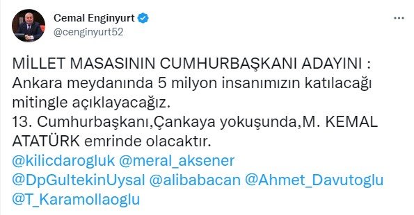 "Millet masasının Cumhurbaşkanı adayını: Ankara meydanında 5 milyon insanımızın katılacağı mitingle açıklayacağız. 13. Cumhurbaşkanı, Çankaya yokuşunda, M. KEMAL ATATÜRK emrinde olacaktır."
